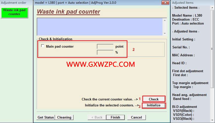點擊Check按鈕,獲取當前廢墨計數器的數值,然后選中計數器前面的選擇框,點擊Initialization按鈕完成初始化。