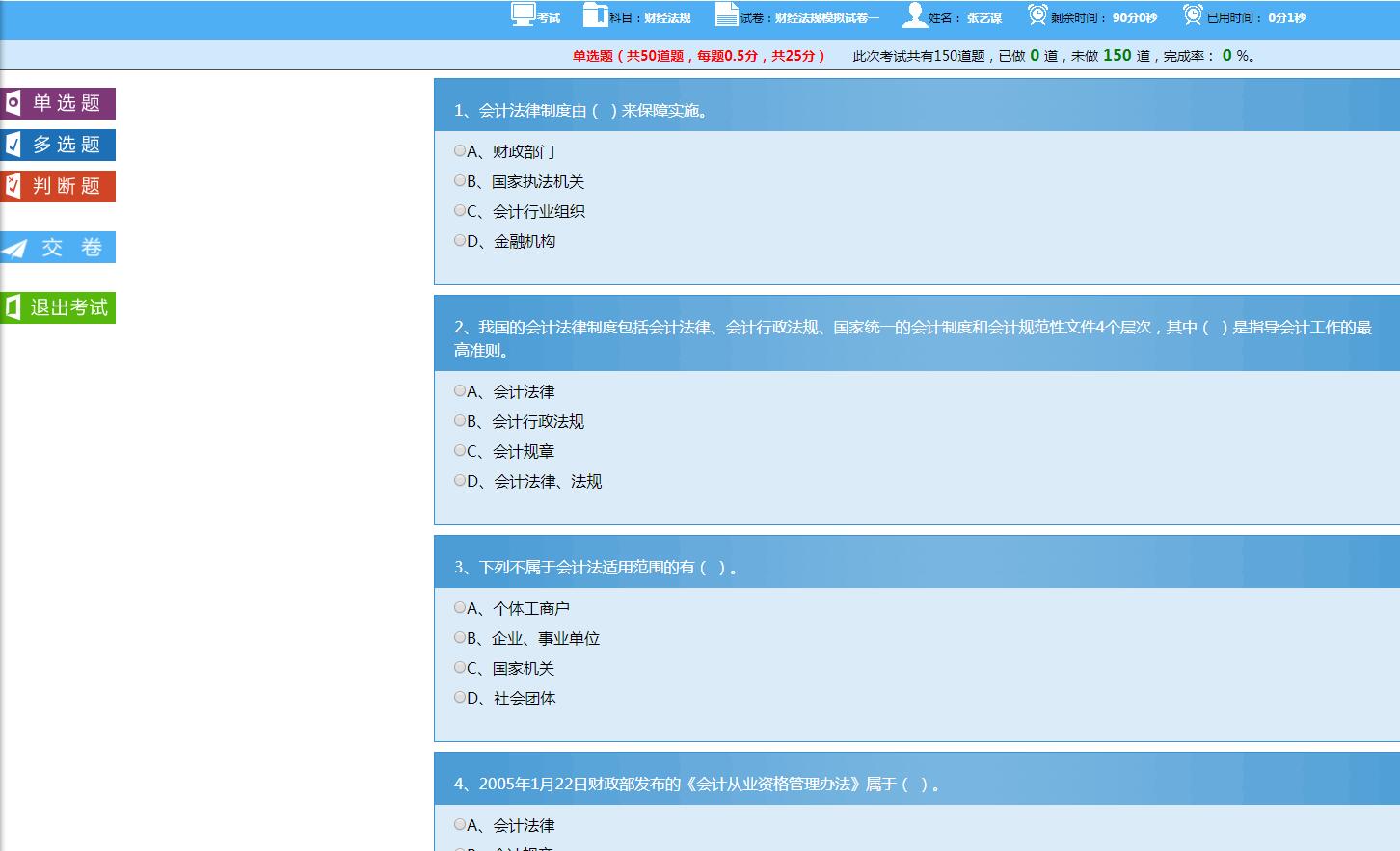 隨機(jī)組卷:此組卷方式在組卷時(shí)需要指定單選、多選及判斷時(shí)需要抽取的題數(shù),在考試時(shí)每個(gè)學(xué)生的試題內(nèi)容及順序不相同,但總題數(shù)是相同的,且都屬于同一科目。